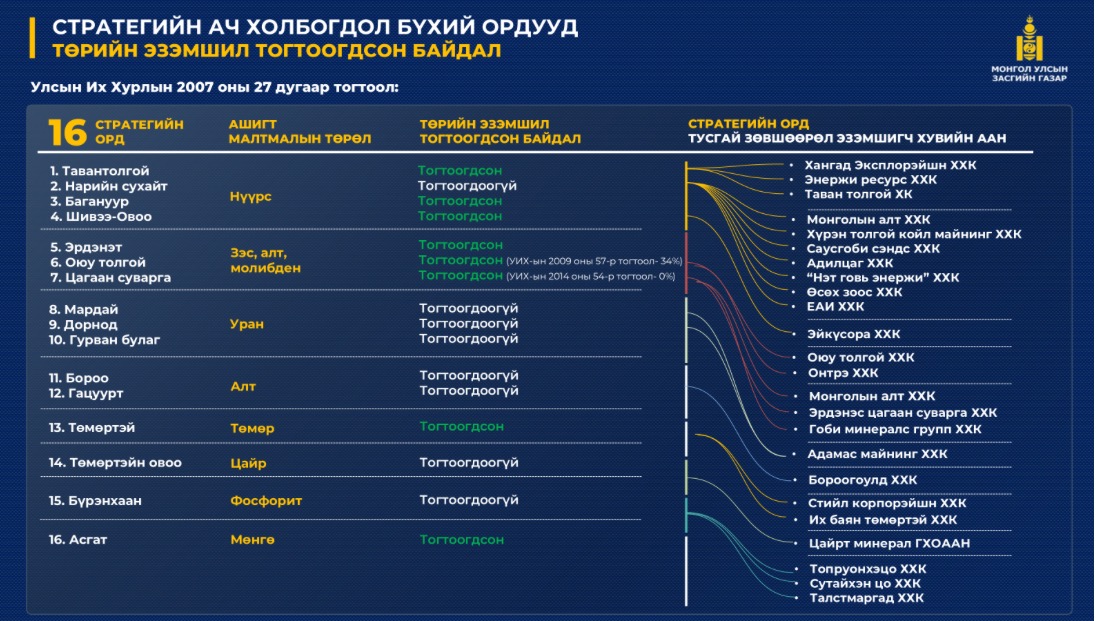 Нэг л тохиолдол бий. Тэр нь 2015 онд “Бороо гоулд”-ыг нэмж, одоогийн 16 ордын жагсаалт амь бөхтэй яваа нь энэ. Өөрөөр нэг ч орд нэмж, хасаагүй.Хамгийн сүүлд 2024 оны 8 дугаар сард АҮЭБ-ын сайдаар ажиллаж байсан Г.Туваанд Засгийн газрын тэмдэглэлээр хоёр үүрэг өгсөн байдаг. Тэмдэглэлийн нэгдүгээрт, “Стратегийн орд газруудын хил заагийг эцэслэн тогтоох” үүрэг бий. Жишээ нь Тавантолгойн бүлэг орд яг хаанаас эхлээд хаана дуусах, Нарийнсухайт ордод хаанаас хаана хүртэл хамаарах гэх зэргээр тогтоож УИХ руу оруулахыг даалгасан. Салбарын яам энэ ажлыг хийж дуусгасан ч Засгийн газар огцроод уг асуудал УИХ руу ороогүй гацсан нь байдаг юм. Үүнийг УИХ-аар оруулахгүйн тулд Засгийн газрыг огцруулах шаардлагатай байжээ ч гэж таамаглах нь бий.