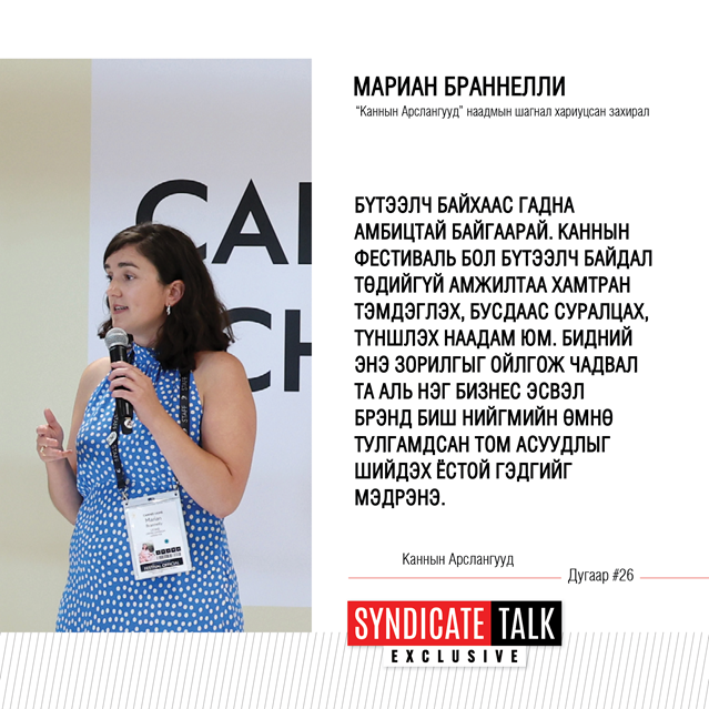 Бүтээлч байхаас гадна амбицтай байгаарай гэж хэлмээр байна. Каннын фестиваль бол зөвхөн бүтээлч байдал төдийгүй амжилтаа хамтран тэмдэглэх, бусдаас суралцах, бусадтай түншлэх дэлхийн хамгийн том наадам юм. Бидний энэ зорилгыг ойлгож чадвал та бүхний ажил зөвхөн аль нэг бизнес эсвэл ямар нэг брэндийн төлөвлөгөөг биелүүлээд зогсохгүй нийгмийн өмнө тулгамдсан том асуудлууд болох тогтвортой хөгжил, ялгаатай, олон талт байдлыг дэмжих гэх мэт асуудлуудыг шийдэх, байгаа орчноо хэрхэн улам сайхан болгох ёстой гэдгийг мэдрэнэ. Бүтээлч байдал бизнест шууд нөлөөлдөг. Нийгэмд ч гэсэн. Энэ бүх эерэг нөлөөллүүдийн давалгааг та бүхнээс тасралтгүй хармаар байна.