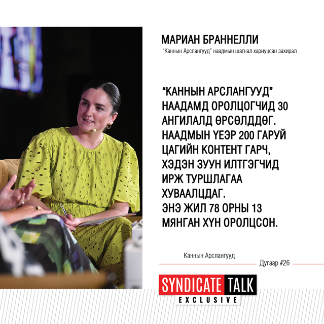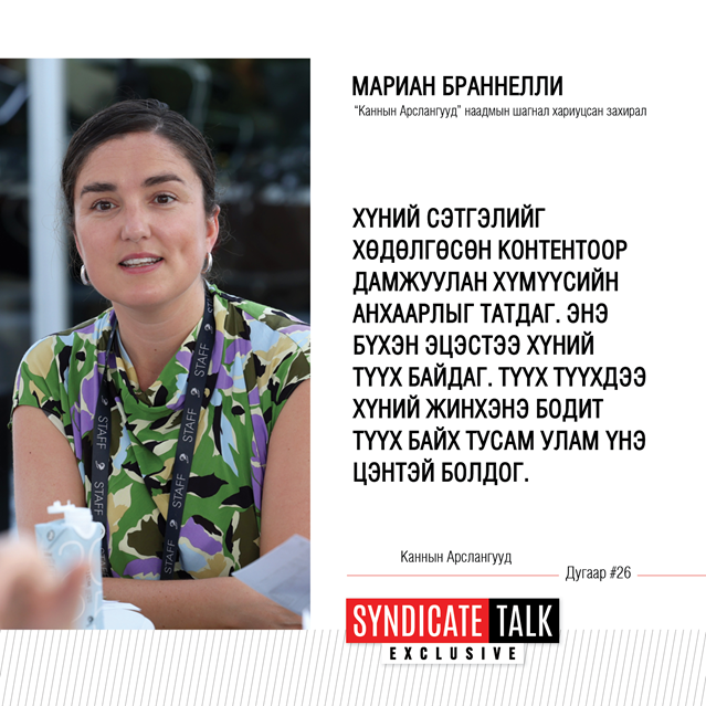 Дэлхийн бүтээлч салбарын ноён оргилд зүйл ёсоор тооцогддог, хамгийн том креатив фестиваль болох алдарт “Каннын Арслангууд наадмын Лондон хотноо байрлах төв оффисоос нэвтрүүлгийнхээ ээлжит шинэ дугаарыг хүргэж байна. Энэ удаагийн зочноор “Каннын Арслангууд” наадмын шагнал хариуцсан захирал хатагтай Мариан Бранелли уригдлаа.