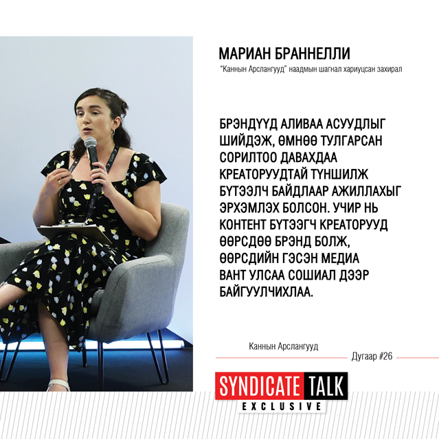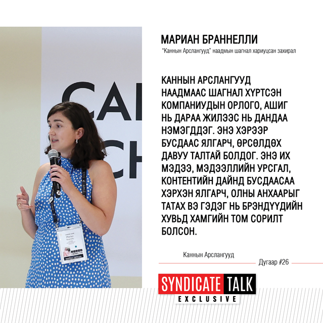 Бид саяхан нэг судалгаа хийж үзсэн. Каннын Арслангууд наадмаас шагнал хүртсэн компаниудын орлого, ашиг нь дараа жилээс нь дандаа нэмэгдсэн байсан. Тухайлбал, эдгээр компаниудын борлуулалт хамгийн багадаа 2.5%-иар өсч, дагаад ашгийн хэмжээ, бүтээлч салбарт оруулсан хөрөнгө оруулалтын өгөөж нь өссөн дүн байна лээ. Тиймээс бүтээлч салбарыг үнэлэн, мэргэжлийн багтай ажиллавал бизнесээ өсгөж, зах зээлд эзлэх байр сууриа нэмэгдүүлэх төдийгүй бүтээгдэхүүний брэнд, компанийн нэр хүндээ өсгөх боломжтой. Энэ хэрээр бусдаас ялгарч, өрсөлдөх давуу талтай болдог. Энэ их мэдээ, мэдэээллийн урсгал, контентын дайнд бусдаасаа хэрхэн ялгарч, олны анхаарыг татах вэ гэдэг нь брэндүүдийн хувьд хамгийн том сорилт болсон.