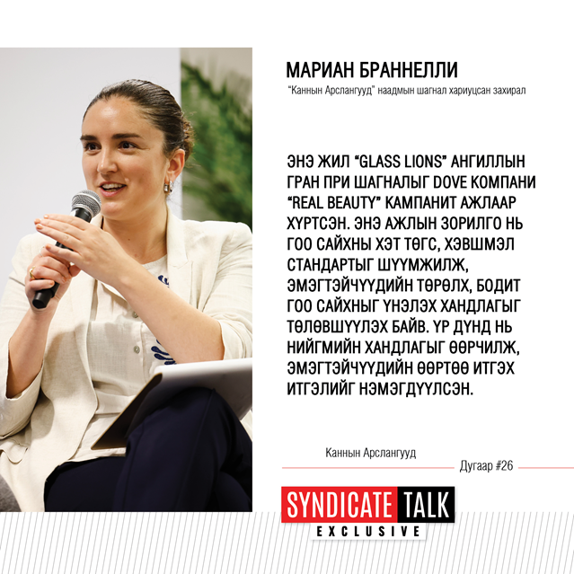 Энэ жил “Glass Lions” ангиллын Гран При шагналыг Dove компанийн “Real Beauty” кампанит ажил хүртсэн. Dove компани энэ кампанит ажлыг сүүлийн 20 жилийн турш хийж байна. “Real Beauty” кампанит ажлын зорилго нь гоо сайхны хэт төгс, хязгаарлагдмал стандартыг шүүмжилж, эмэгтэйчүүдийн төрөлх, бодит гоо сайхныг үнэлэх хандлагыг төлөвшүүлэх явдал байв. Үр дүнд нь Dove брэнд дэлхий даяар нийгмийн хандлагыг өөрчилж, эмэгтэйчүүдийн өөртөө итгэх итгэлийг нэмэгдүүлсэн. Улмаар компани гоо сайхны салбарт асар том соёлын өөрчлөлт хийсэн төдийгүй бизнесээ, брэндийн үнэ цэнээ 350%-иар өсгөж чадсан. Энэ бол аливаа компани зөвхөн борлуулалт хийж мөнгө олох биш зарж буй бүтээгдэхүүн, үйлчилгээгээр дамжуулан нийгэмд хөрөнгө оруулах ёстой гэдгийн үлгэр жишээ юм. Энэ мэт манай наадмаар дамжсан маш олон жишээ, кэйсийг би хэлж чадна.