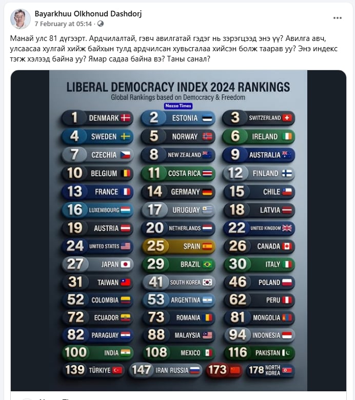 Facebook хуудсандаа пост болгоод би биччихсэн–Манай улс 81 дүгээрт. Ардчилалтай, гэвч авилгатай гэдэг нь зэрэгцээдэнэ үү? Авилга авч, улсаасаа хулгай хийж байхын тулдардчилсан хувьсгалаа хийсэн болж таарав уу? Энэ индекстэгж хэлээд байна уу? Ямар садаа байна вэ? Таны санал?