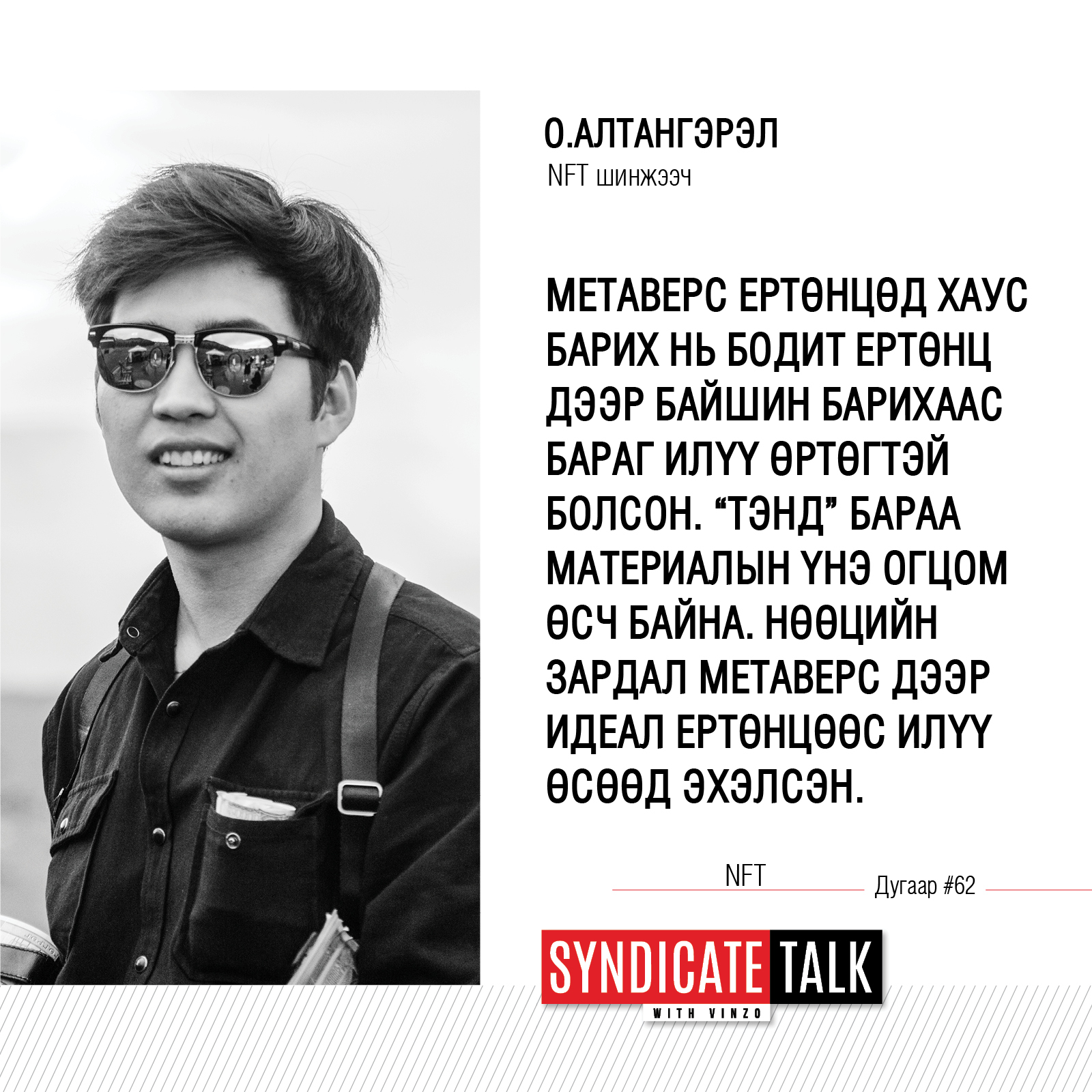 О.Алтангэрэл: Одоо метаверс ертөнцөд хаус барих нь бодит ертөнц дээр байшин барихаас бараг илүү өртөгтэй болсон. “Тэнд” бараа материалын үнэ огцом өсч байна. Бараа материалын зардал метаверс дээр идеал ертөнцөөс илүү өсөөд эхэлсэн.