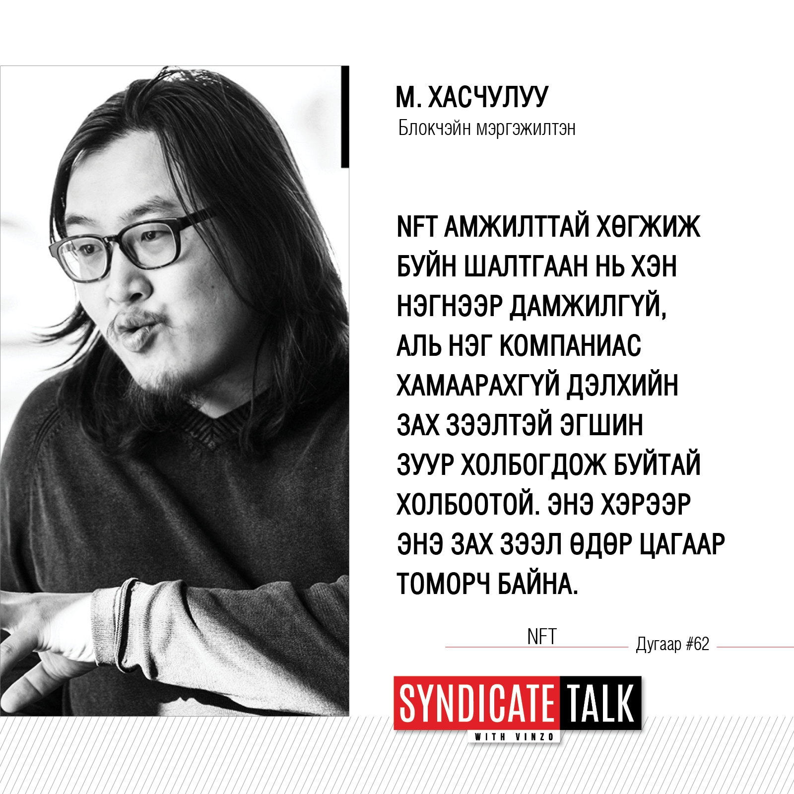 М.Хасчулуу: NFT амжилттай хөгжиж буйн шалтгаан нь блокчэйн ашиглан хэн нэгнээр дамжилгүй, аль нэг компаниас хамаарахгүй дэлхийн зах зээлтэй эгшин зуур холбогдож буйтай холбоотой. Энэ хэрээр энэ зах зээл өдөр цагаар томорч байна. Энэ хэрээр метаверс ертөнц хөгжиж байгаа. Фэйсбүүк метагаа сая NFT-тэй холбоно гэдгээ зарлачихлаа. Ингэхээр тухайн хүний метаверс ертөнцөд барьсан байшин, бүтээсэн хөрөнгө бүгд өөрийнх нь өмчлөлд шилжинэ гэсэн үг.