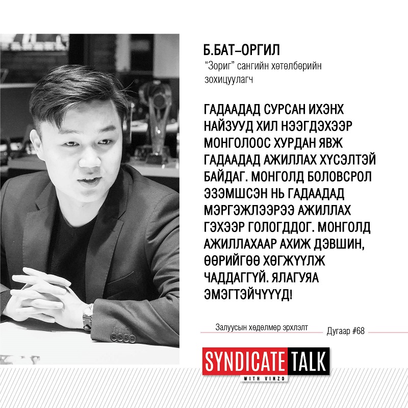 Б.Бат-Оргил: Гадаадад боловсрол эзэмшсэн ихэнх найзууд маань хил нээгдэхээр Монголоос хурдан явж гадаадад ажиллах хүсэлтэй байдаг. Санхүү, хөрөнгө оруулалт, эдийн засгийн чиглэлээр гадаадад сурсан залуус АНУ-д жишээ нь жилийн 100 мянган ам.долларын цалинтай ажилд орох боломжтой байхад тэднийг Монголд сарын 1.5 сая төгрөгөөр үнэлдэг. Иймээс тэд бушуухан Монголоос явъя гэдэг. Тэднийг буруутгах ямар ч аргагүй. Учир нь ид ажлын насан дээрээ эдгээр боломжийг ашиглах ёстой. Харин Монголд боловсрол эзэмшсэн нь гадаадад мэргэжлээрээ ажиллах гэхээр хэл, дотоодын сургуулийн нэр хүнд, чанараар гологдож, хүлээн зөвшөөрөгдөж чаддаггүй. Монголд ажиллахаар ахиж дэвшин, өөрийгөө хөгжүүлж чаддаггүй. Ялангуяа эмэгтэйчүүд! Цэцэрлэгт байхаас нь эхлээд хүүхдүүдэд мэргэжлээ сонгох мэдээ, мэдээллийг өгөх нь маш чухал гэдэгтэй санал нийлдэг. 10 жилийн хүүхдүүдэд мэргэжлээ сонгоход нь туслах зорилгоор “Залуу дадлагажигч” гэдэг хөтөлбөрийг “Зориг” сангаас тав дахь жилдээ хэрэгжүүлж байна. Мэргэжлээ анхнаасаа зөв сонгох нь залуусын хувьд маш чухал асуудал.